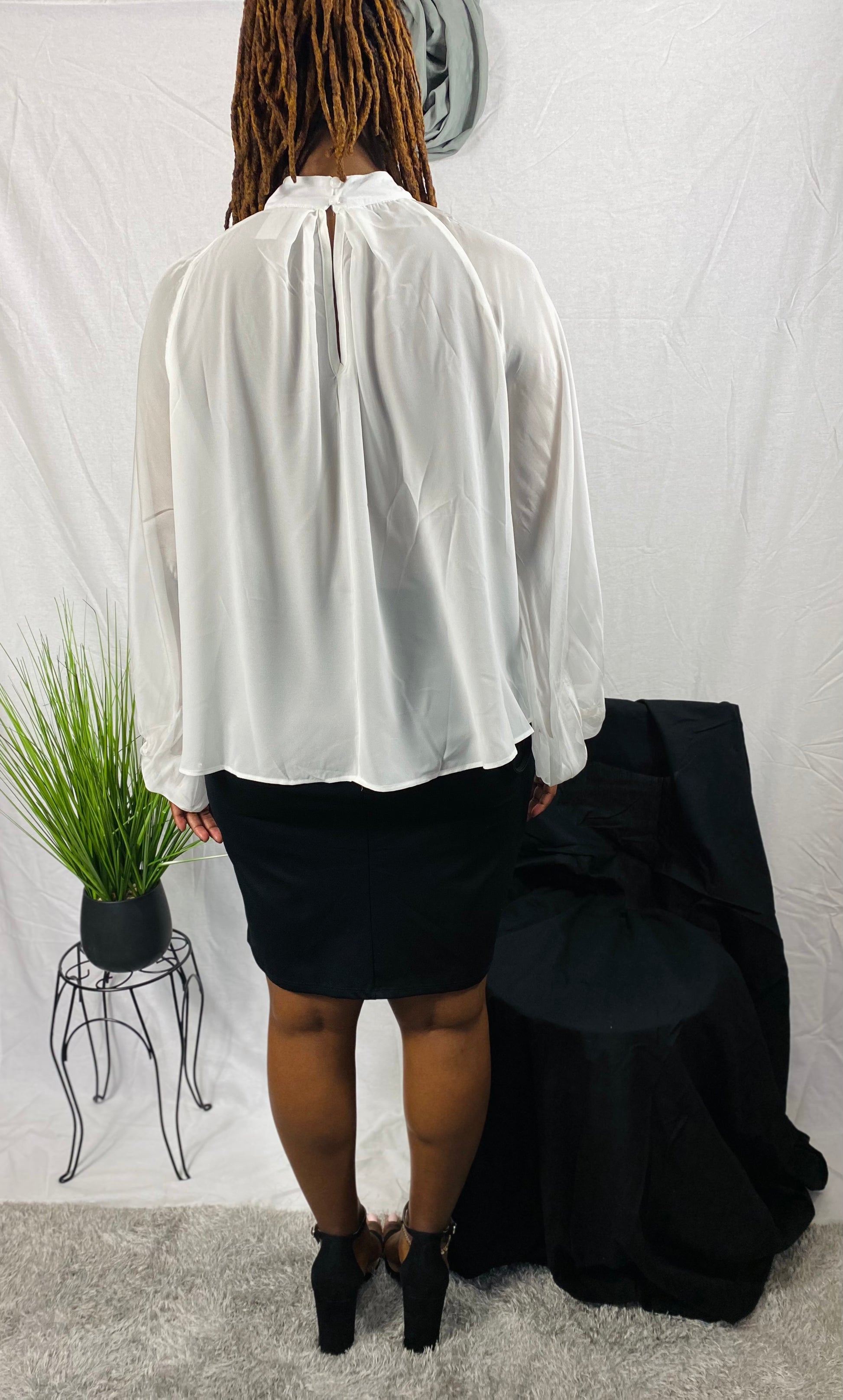 Women's white, bishop sleeve, bow blouse.