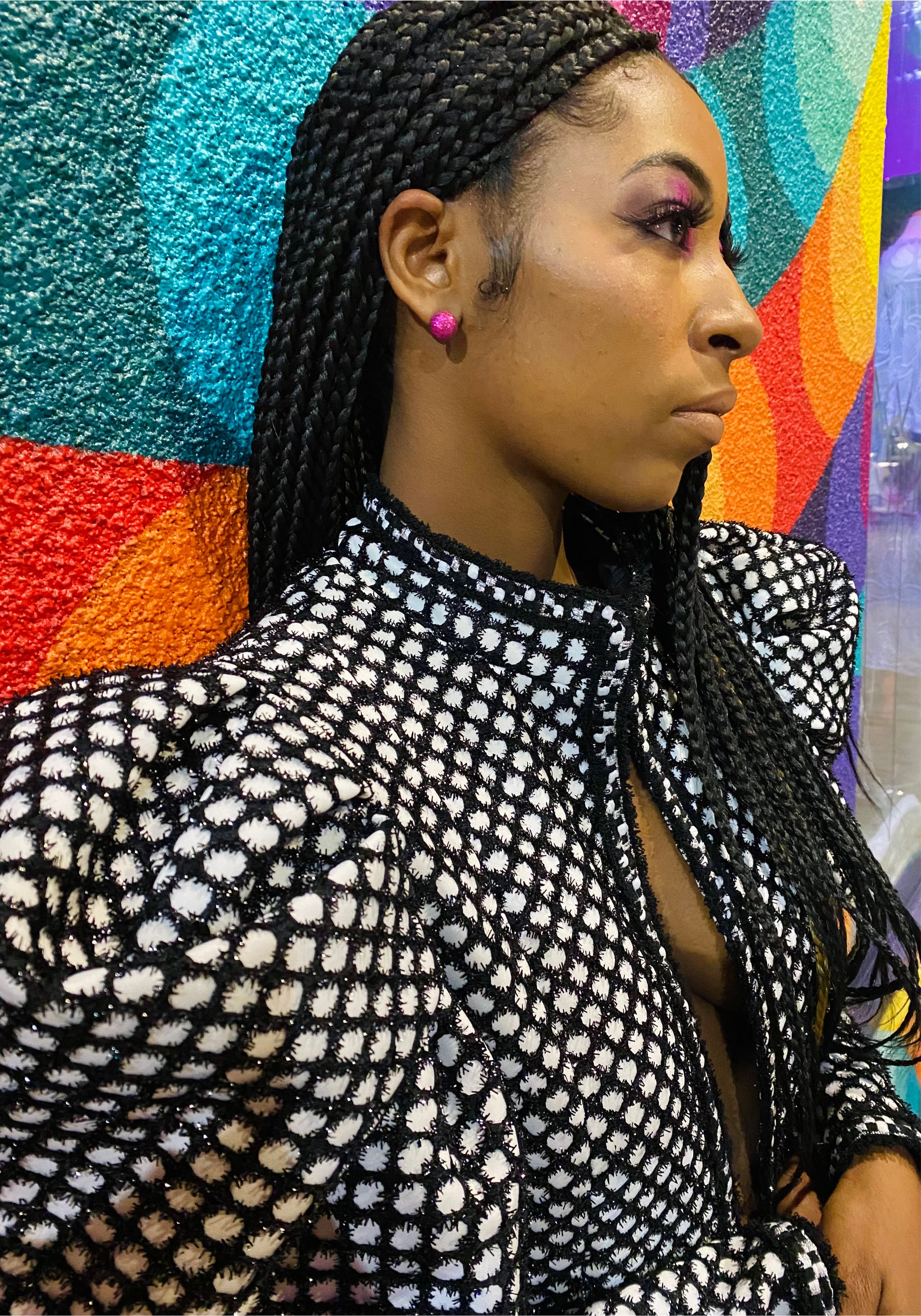 Black and white mutton-sleeve tweed jacket with pearl buttons in the sleeve.