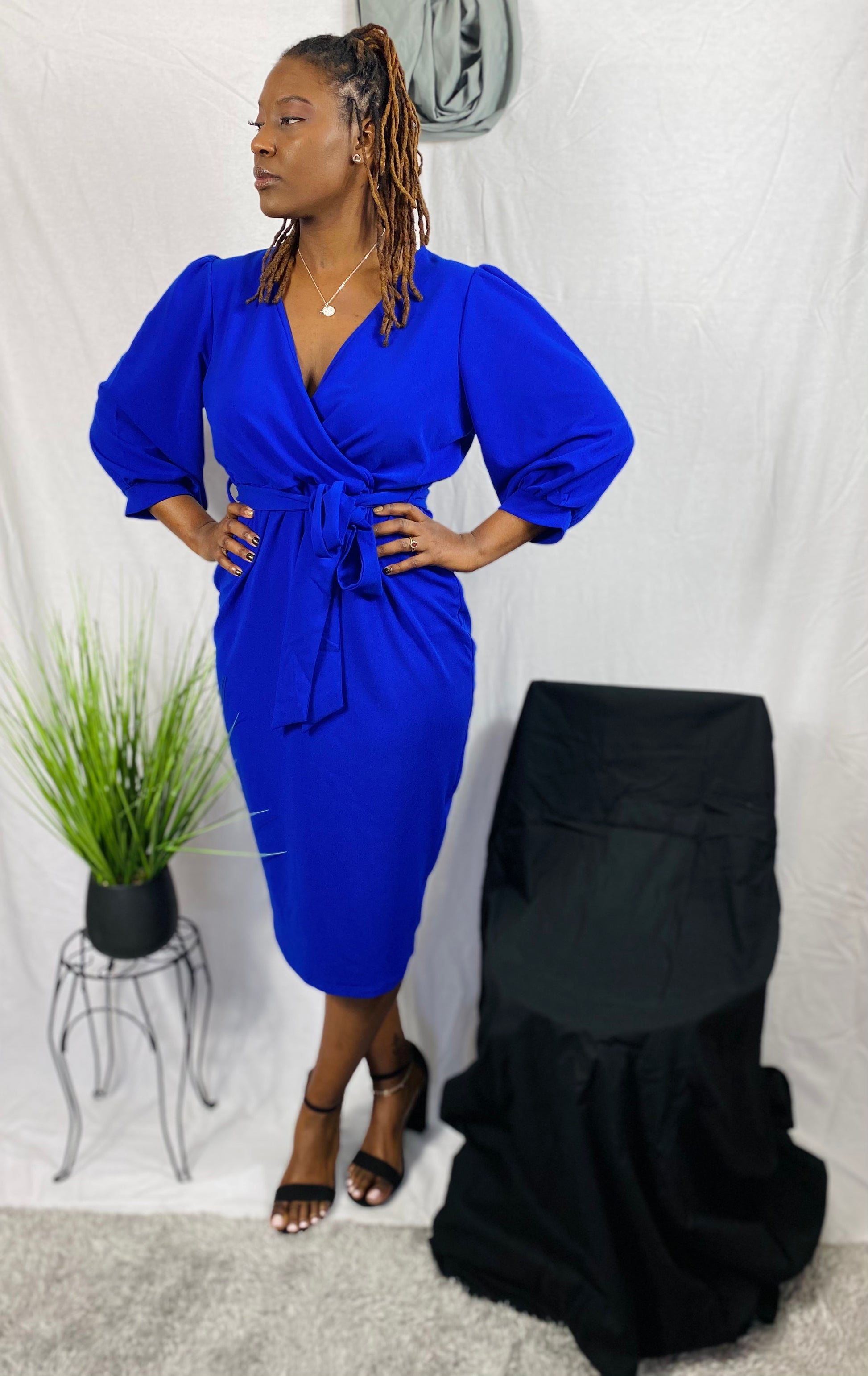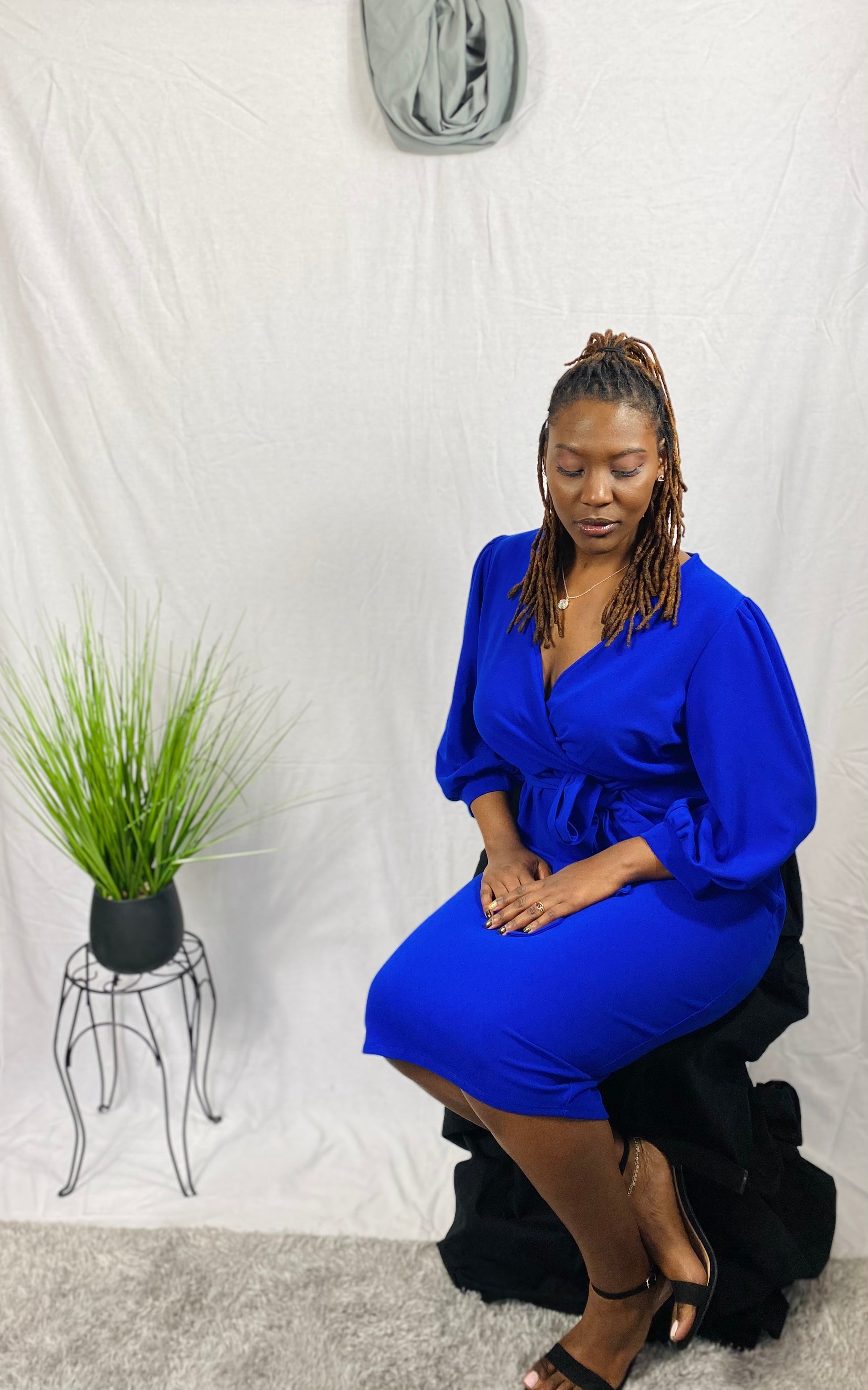 Royal blue & Blush Pink Bishop sleeve dress with tie around the waist.